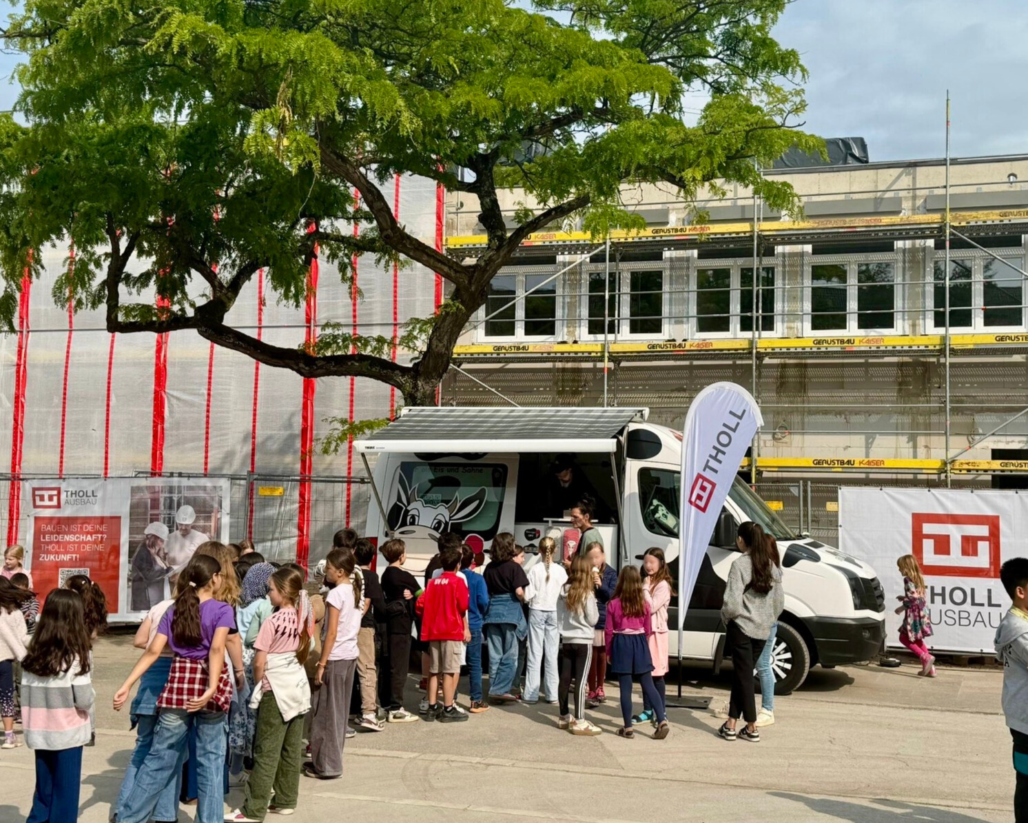 Neben Zahlen, Plänen und Baufortschritt gab es auch viele emotionale Momente. Besonders eindrucksvoll: Eine Schülergruppe überraschte das Bauteam mit einer musikalischen Generalprobe. Für strahlende Kinderaugen sorgte außerdem ein Eiswagen der Kuhbar, den wir als kleines Dankeschön auf den Schulhof holten.