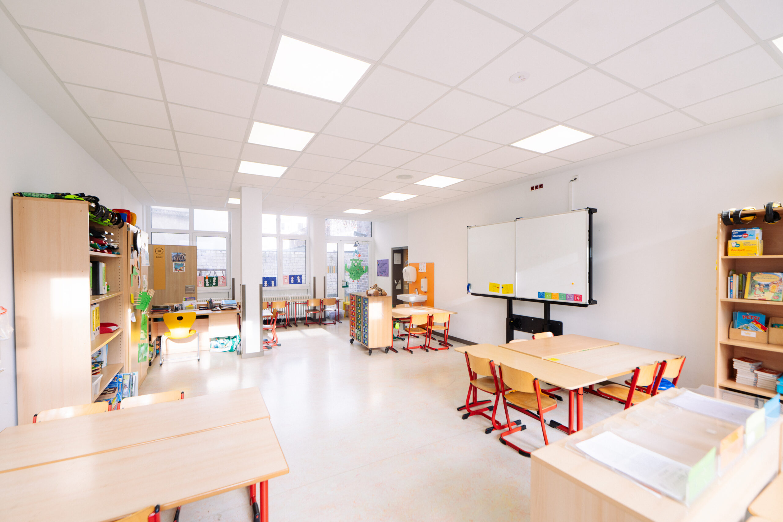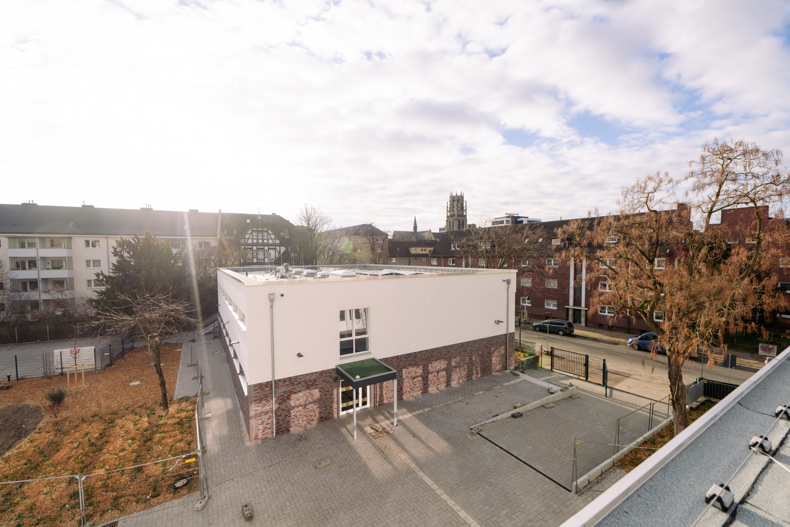 An der Blumenthalstraße in Düsseldorf entsteht ein moderner Bildungsort: Die Thomas-Schule wird umfassend modernisiert – vom Rohbau bis zur Reinigung. Während der Unterricht im Hauptgebäude regulär weiterläuft, erneuern wir auf rund 1.800 m² das Nebengebäude und die Sporthalle und schaffen mit einem Anbau zusätzliche Räume für zeitgemäße Pädagogik.